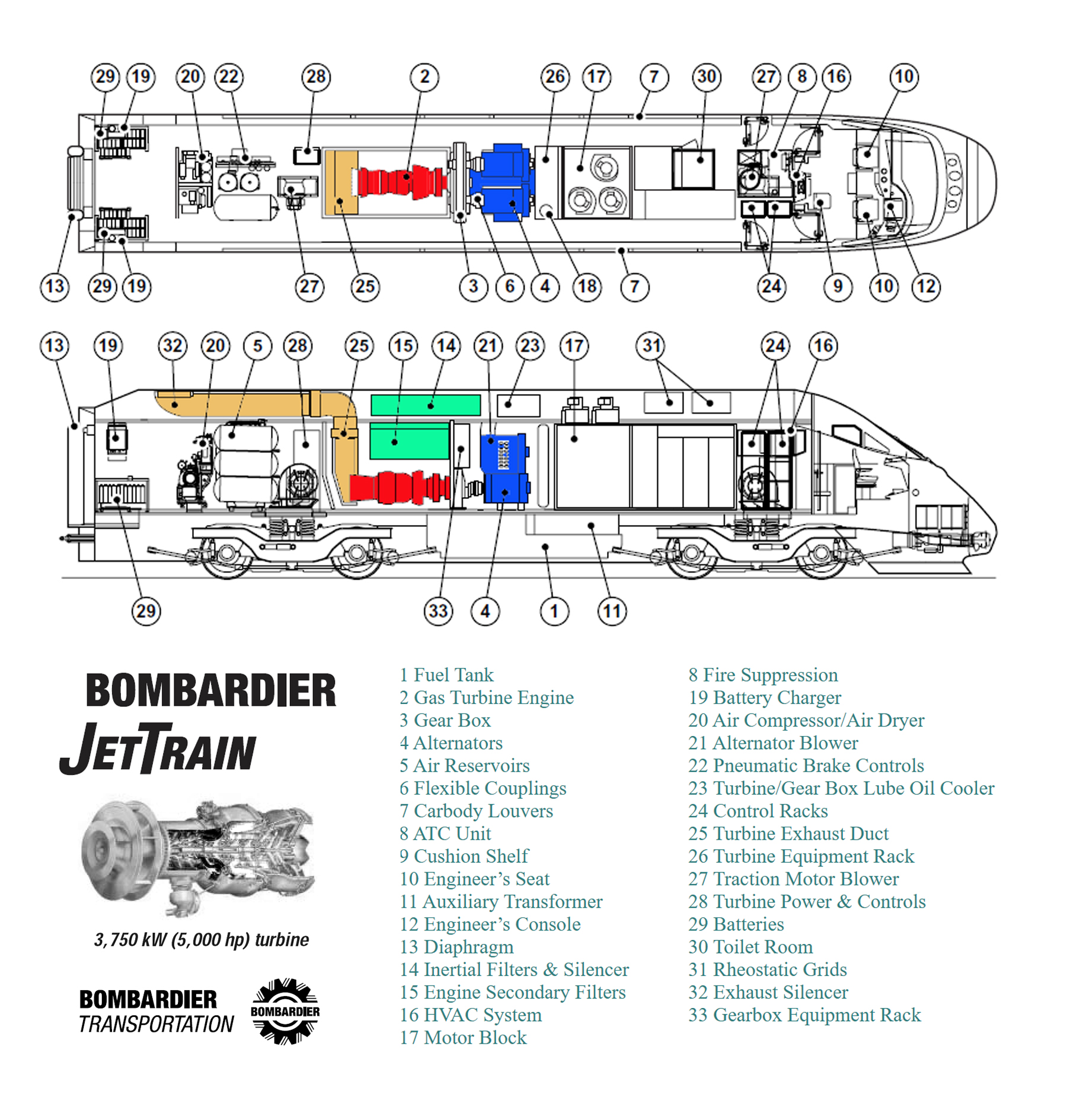 That model train was the JetTrain locomotive or “power car”, the gas-turbine version of the electric Acela trainset developed by the former Canadian rail and aerospace manufacturer Bombardier Transportation (purchase in 2020 by Alstom) in partnership with the Federal Railroad Administration (FRA).