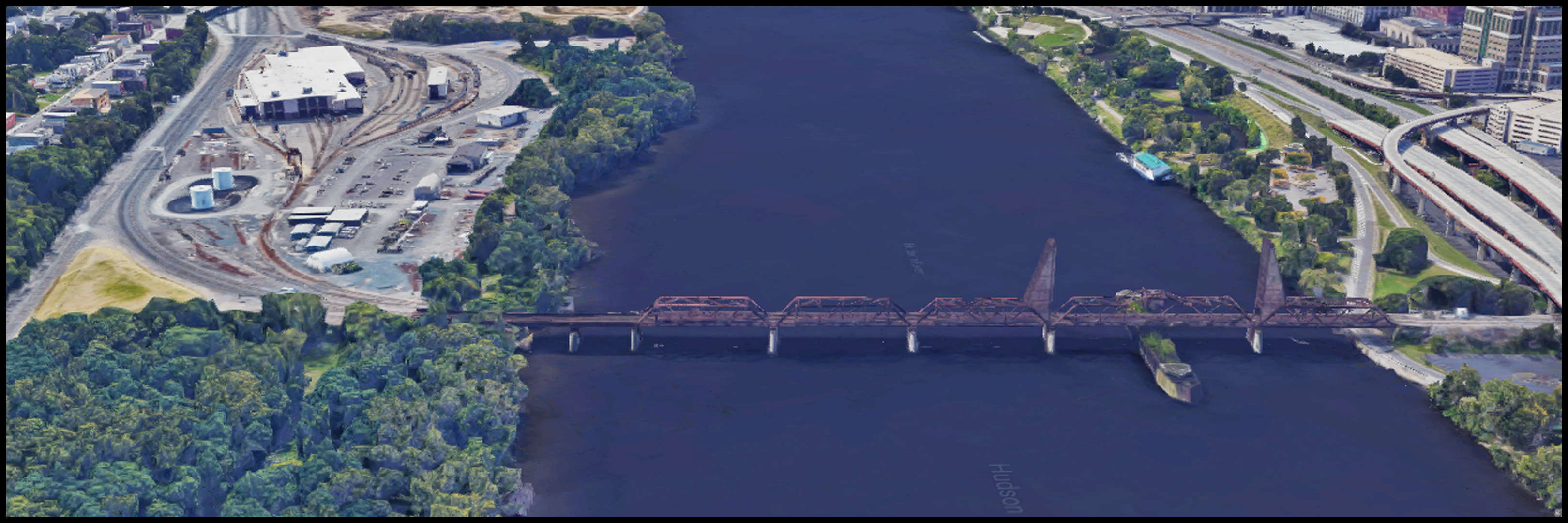 The Livingston Ave Bridge (LAB bridge) viewed from the north, with Albany to the right (west) and the Rensselaer yard and maintenance facility to the left (east). The bridge including the existing stone piers were orinally built in the late 1860s, with the steel superstructure rebuilt in the early 1900s. The central span of the movable bridge swings open to allow ships and large boats to pass.