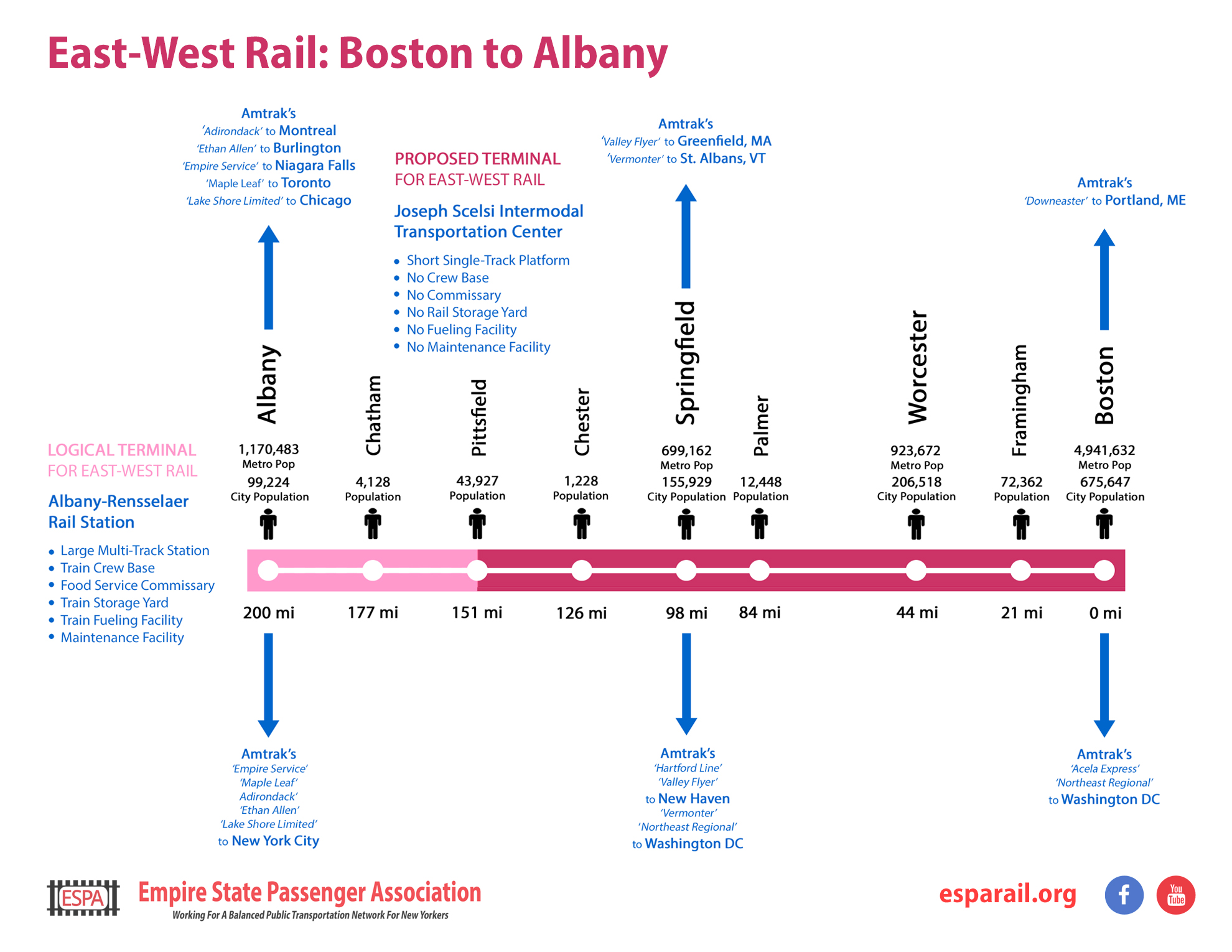 The study does not consider service through to the Capital District, and this is unwise. Albany is the logical terminal for a future East-West rail service to the Berkshires. Albany-Rensselaer is Amtrak's ninth-busiest station, serving a metro region of over a million people. Including it would considerably boost ridership and revenue compared to a train terminating at Pittsfield. At Rensselaer there is also an existing Amtrak crew base, maintenance facility, and currently an operating food service commissary.