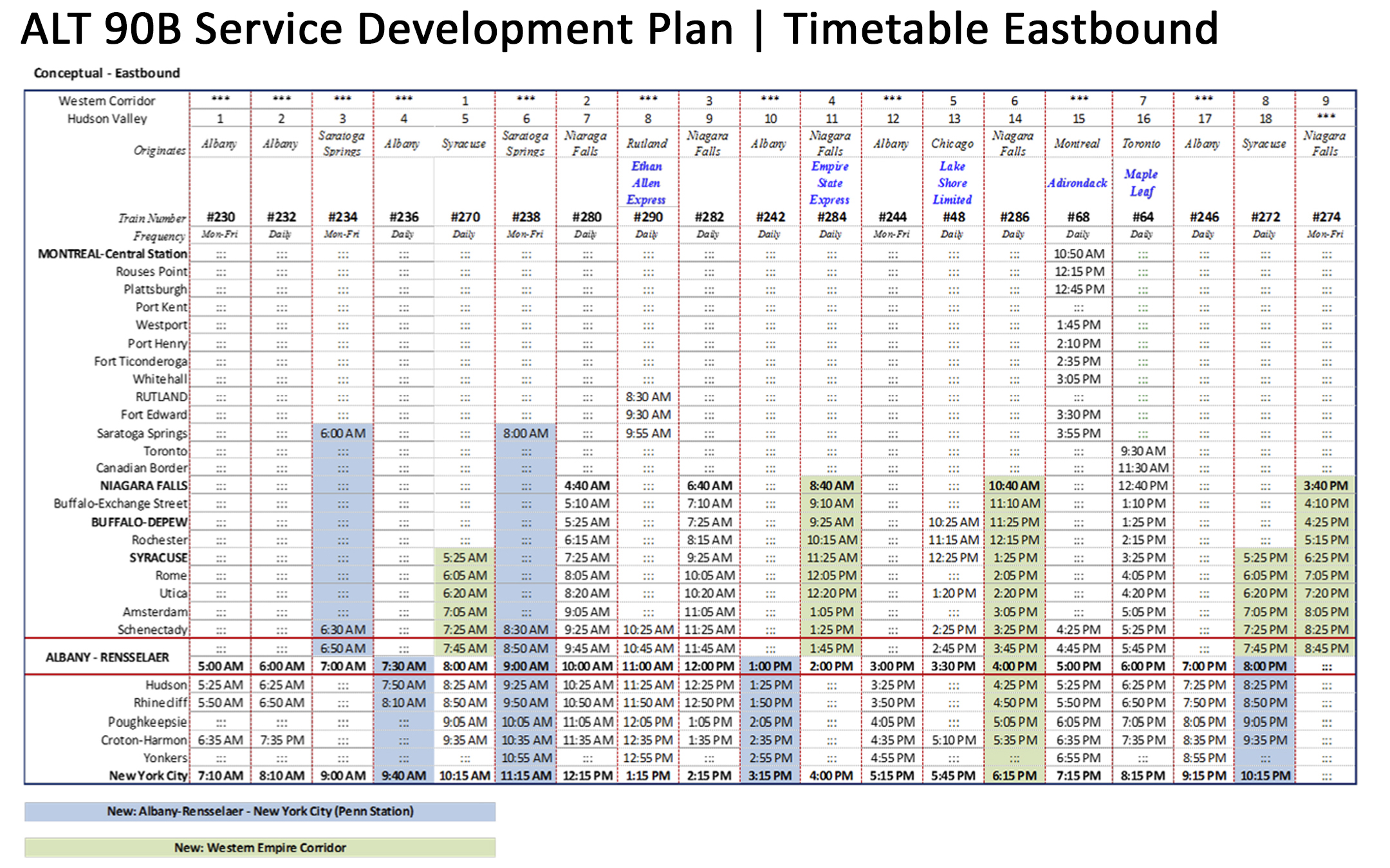 ABOVE: An infographic showing the planned implementation of ALT 90B under the Service Development Plan, including the addition of additional train frequencies. NYSDOT is working on an update of the Service Development Plan, that will hopefully speed up implementation.