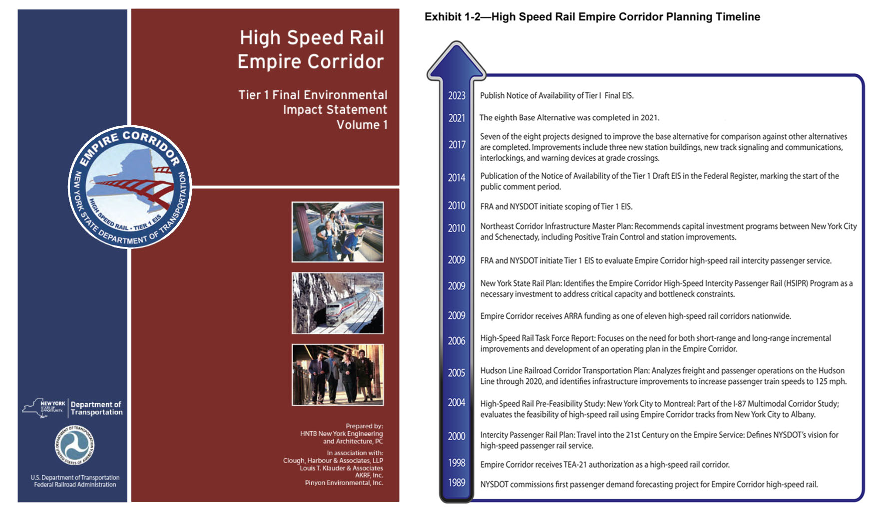 The Federal Railroad Administration (FRA) signed off on the Tier I Final Environ-mental Impact Statement (FEIS) for the Empire Corridor on February 2, 2023 – the Notice of Availability appearing in the Federal Register on February 17, 2023. It had been a long process, taking over 15 years and 4 months*, starting in 2009 with the issuance of a notice of intent to prepare an environmental impact study, with the Draft EIS released for public comments and several open house hearings in Spring 2014.