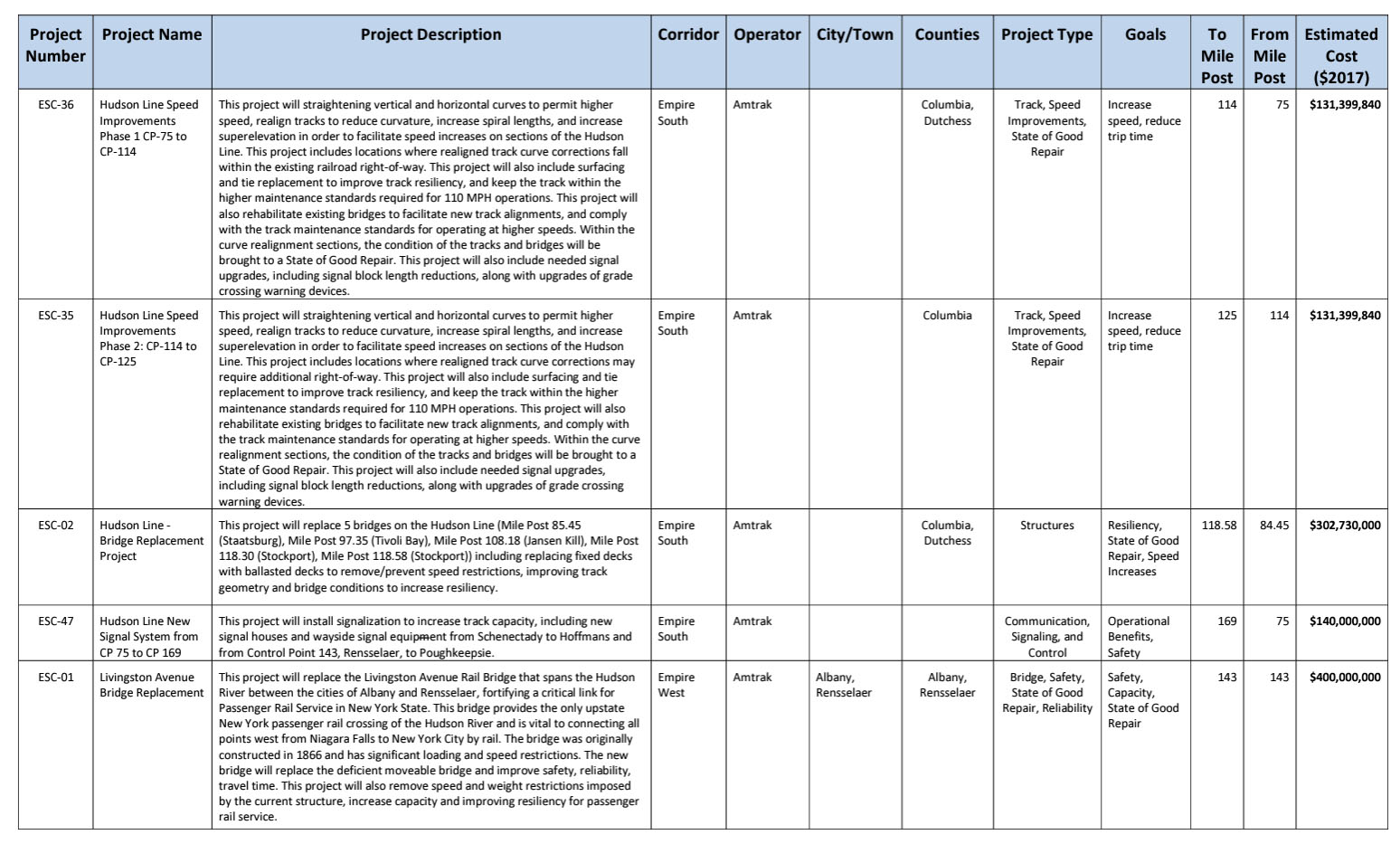 These civil engineering projects will together improve reliability, increase frequency, and reduced travel times for Amtrak service. They include: a second track on the Empire Connection, two sections of third track south of Poughkeepsie and yard improvements at Poughkeepsie, signaling and interlocking upgrades, rock slope stabilization, bridge replacements, track work to increase speeds to 90 and 110-mph, and new high-level platforms at the Rhinecliff and Hudson stations.