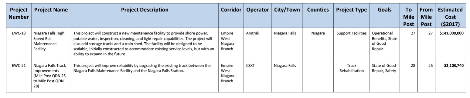 A new Buffalo-Depew Station would be constructed with a new high-level platform and new interlockings, serving new third and fourth passenger tracks. The Exchange Street and Niagara Falls stations having been recently been rebuilt, will see little additional work. On the site of an existing freight yard, a new Niagara Falls Maintenance Facility is being planned; to provide shore power, potable water, inspection, cleaning, and light repair capabilities. The facility will include storage tracks and climate control buildings, as opposed to the current situation where train maintenance is conducted by Amtrak personnel outdoors in the elements.