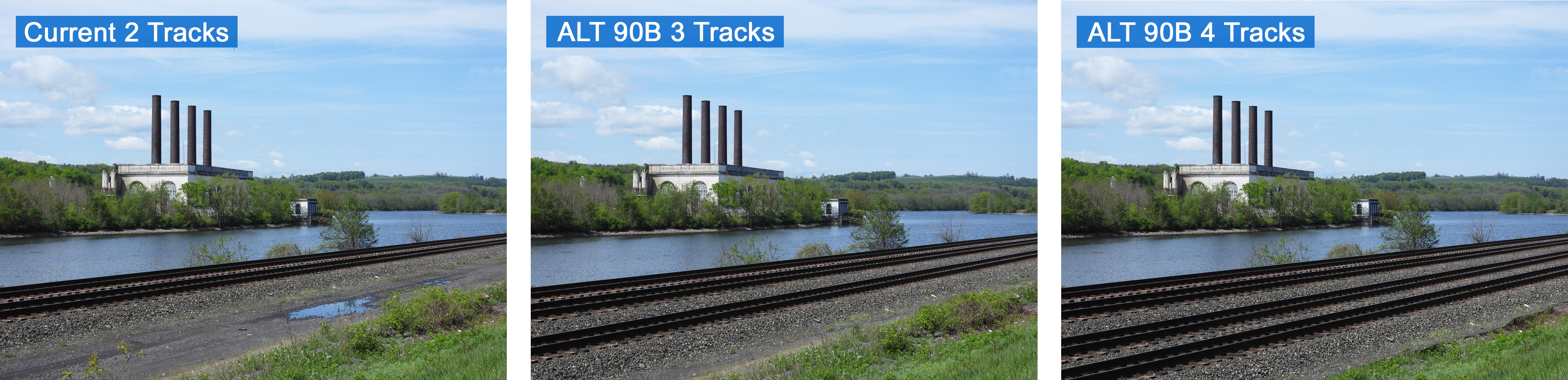 Alternative 90B would add a total of approximately 370 miles of additional trackage to segregate passenger rail and freight trains, essentially constituting a parallel railway to the existing double-track mainline. There would be a third dedicated passenger track for approximately 273 miles between Schenectady (MP 159) and Buffalo-Depew (MP 432), and an additional fourth passenger track for approximately 39 miles in five separate sections, allowing for the passing at speed of opposing passenger trains.