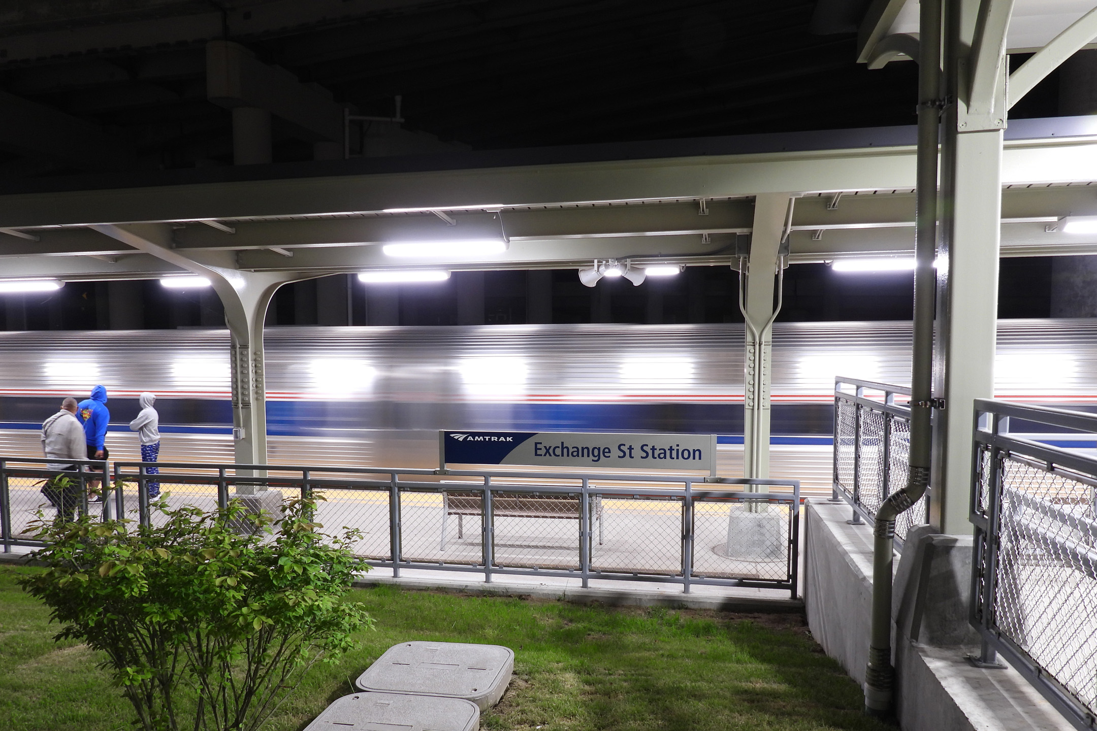 ABOVE: An evening train from New York City departing Exchange Street Station in Downtown Buffalo for Niagara Falls.