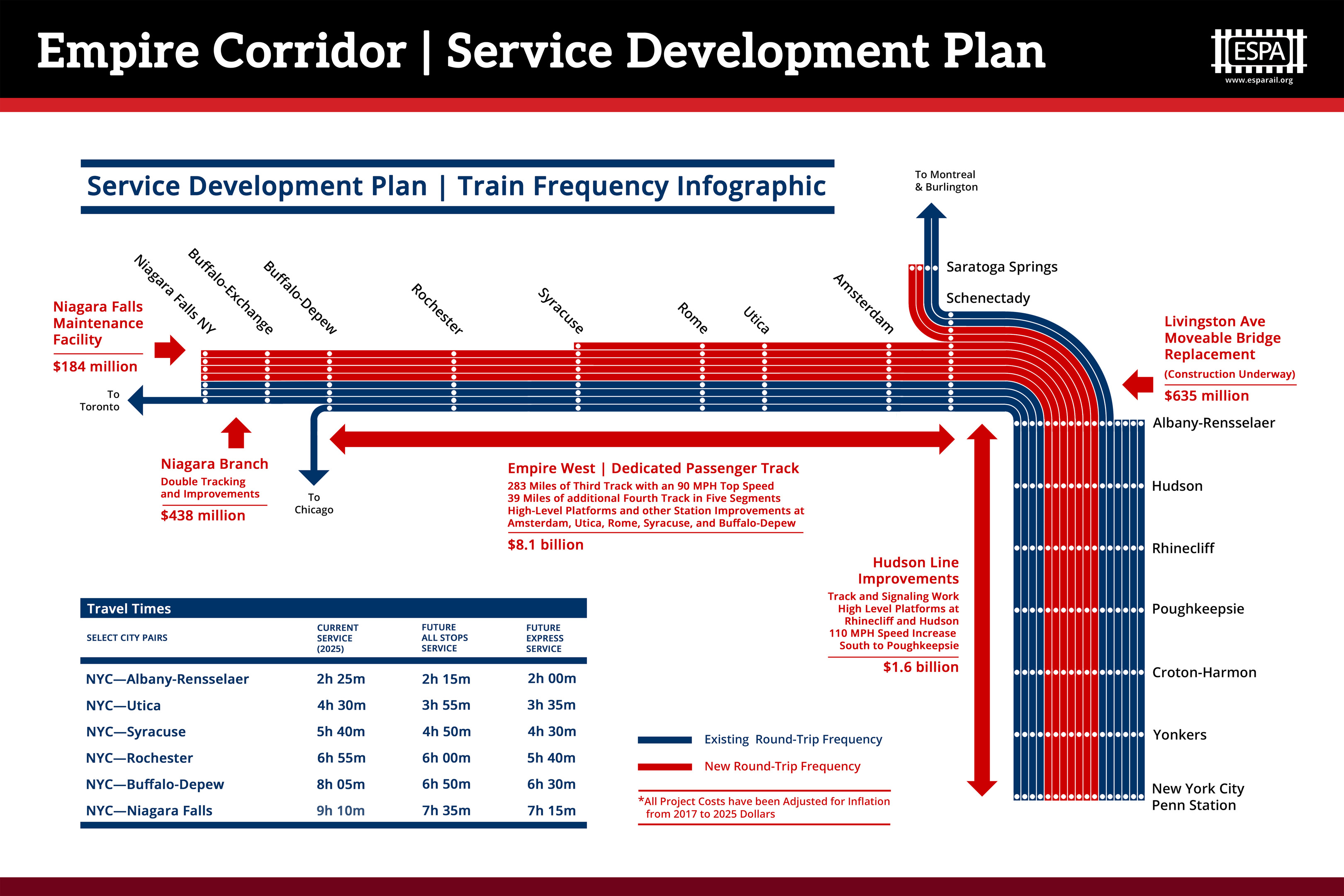 ABOVE: An infographic showing the transformation of intercity passenger rail service along the Empire Corridor in terms of speed and frequency, contrasting current service with that proposed by the Service Development Plan of ALT 90B.
