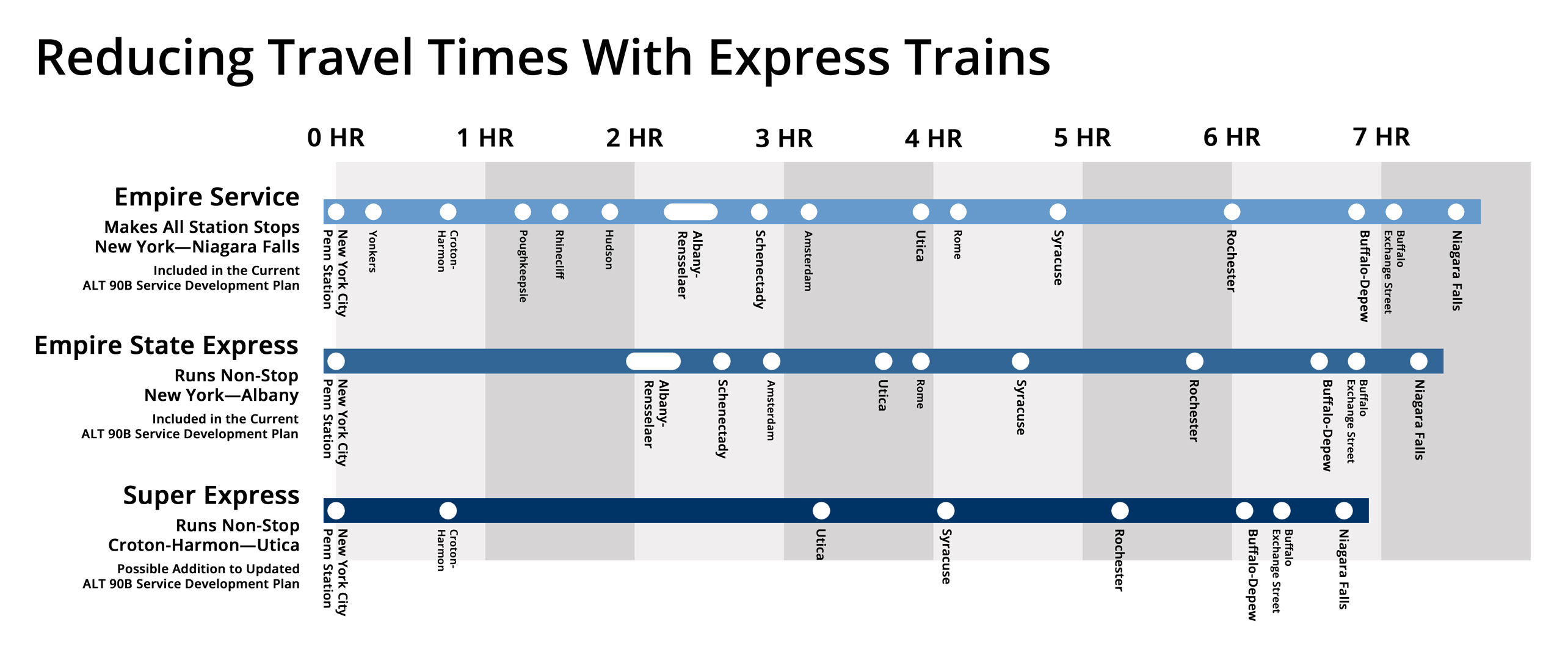 ABOVE: An infographic illustrating the reduction in travel times between major destinations by skipping intermediate stations for some limited-stop express frequencies. The top two train frequencies – Empire Service and Empire State Express – are included in the ALT 90B Service Development Plan, the bottom “Super Express” is a possible express service that could be included in an updated Service Development Plan.
